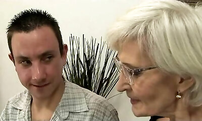 Granny enjoys the young cock in her hairy cunt