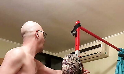 He tests his brand fresh dildo machine on his bondaged marionette