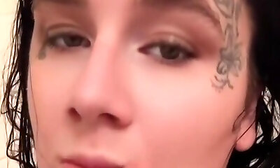 Girl in tattoos masturbates with vibrator in camper
