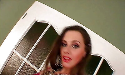 Sexy and busty brunette babe plays with a huge dildo